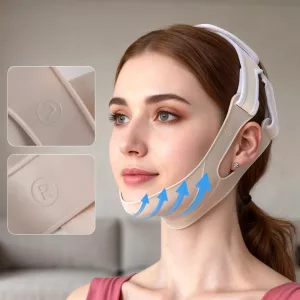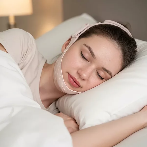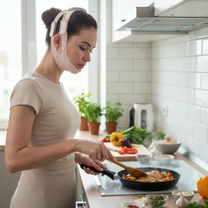 Comprei isto para a minha rotina de autocuidado noturna. É elástica, confortável nas orelhas, e a área abaixo do meu queixo parece mais lisa e menos inchada.