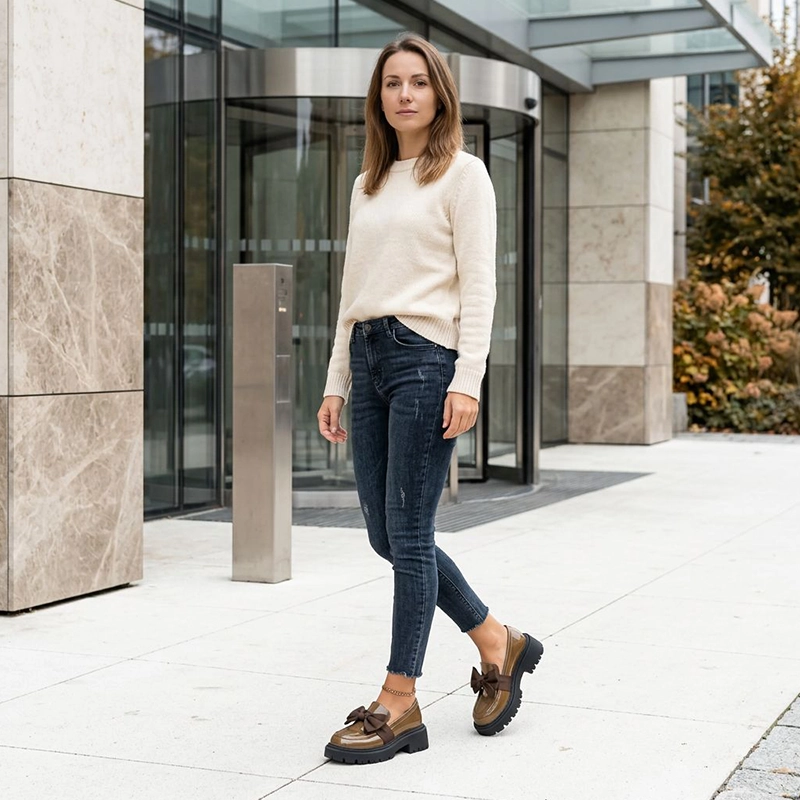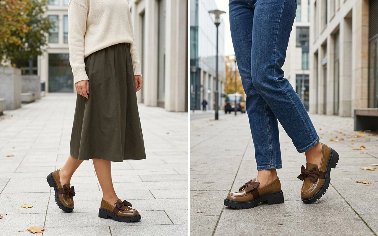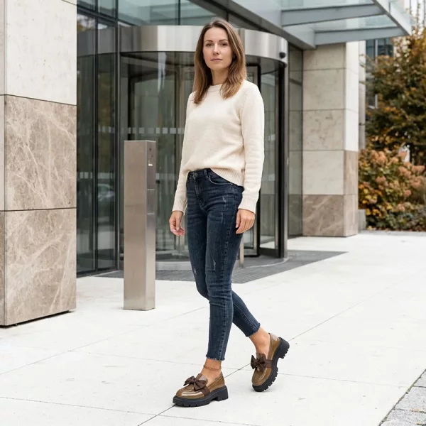 A silhueta clássica britânica combina perfeitamente com jeans, saias e vestidos. As plataformas Ortorex vão das aulas aos jantares, evitando trocas de roupa.