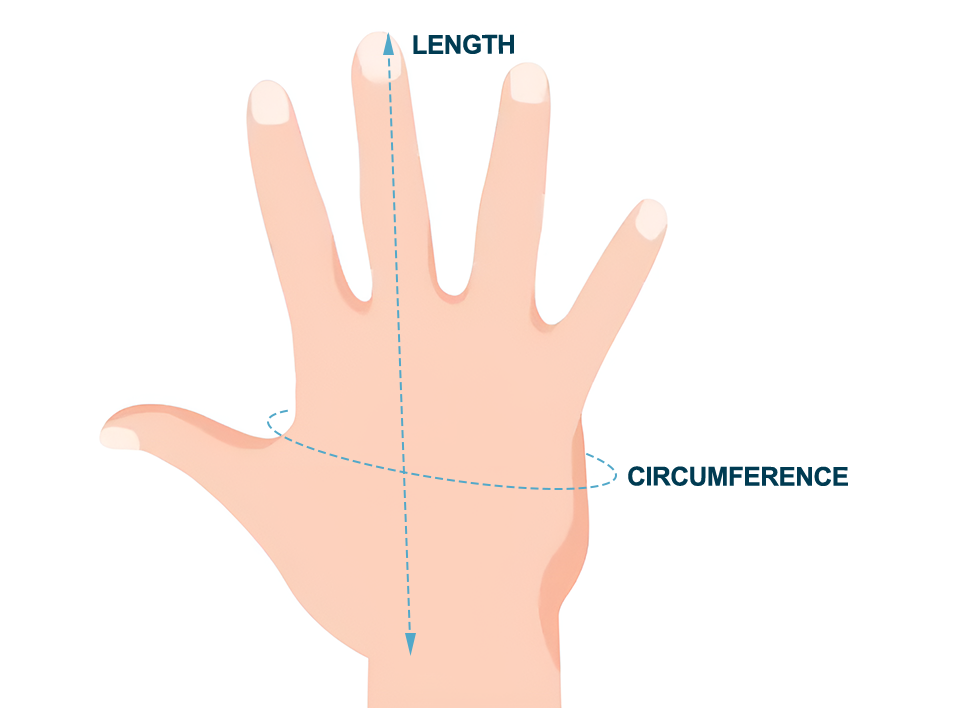 - 1. Estique a fita métrica da base da sua palma até a ponta do dedo médio.
