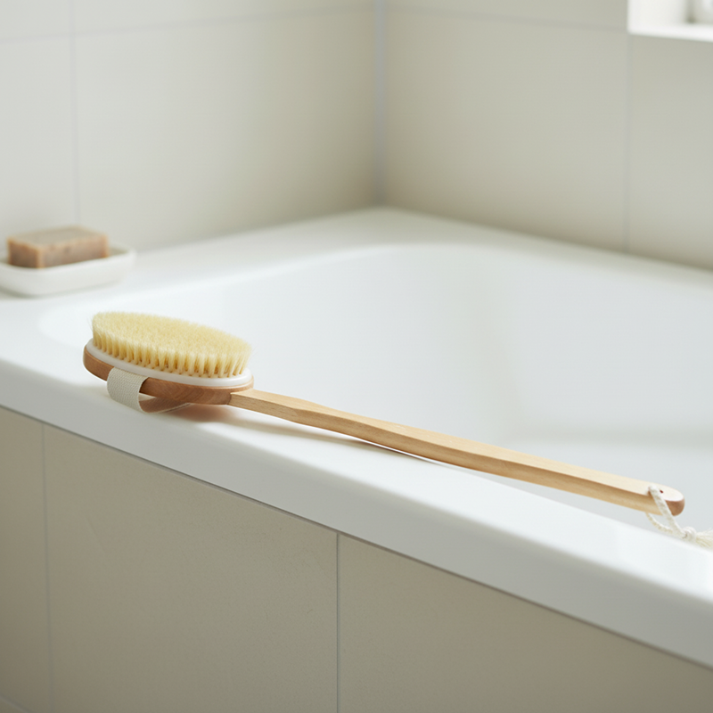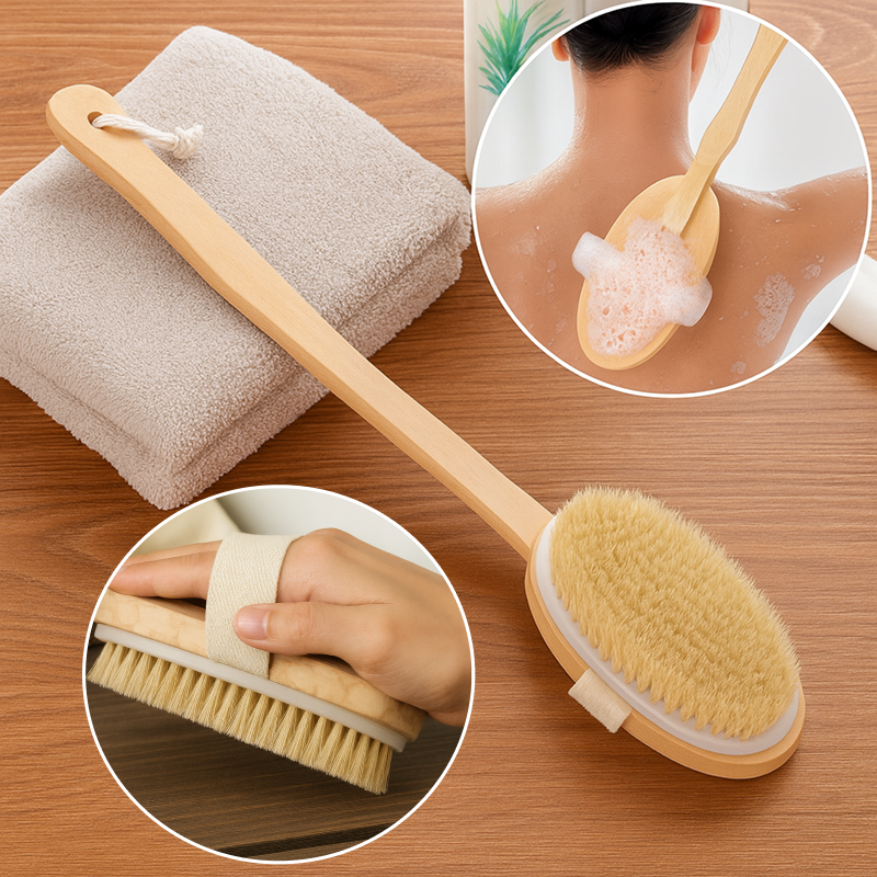 Depois que comecei a usar esta escova de madeira, minha pele ficou mais macia. Consigo alcançar todas as partes que antes não conseguia e é ótimo após esportes.
