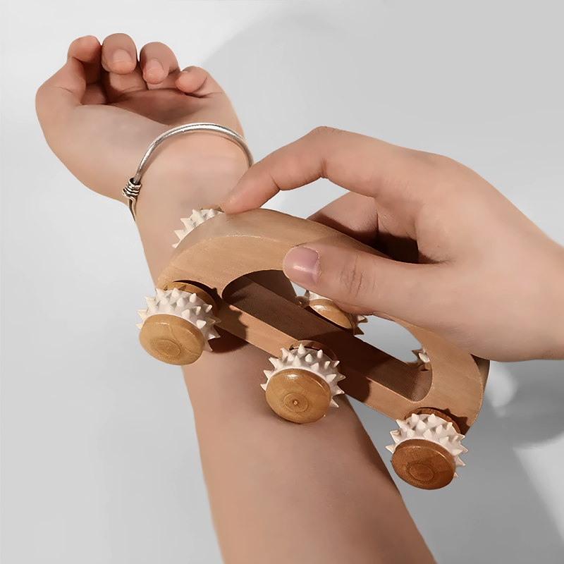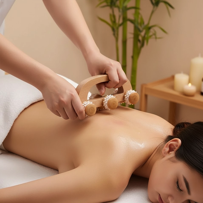 A construção em madeira ecológica garante que nenhum plástico agressivo toque na pele. As pontas de silicone suaves tornam cada sessão relaxante e segura.