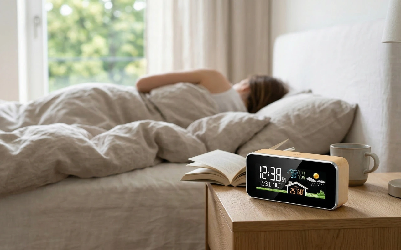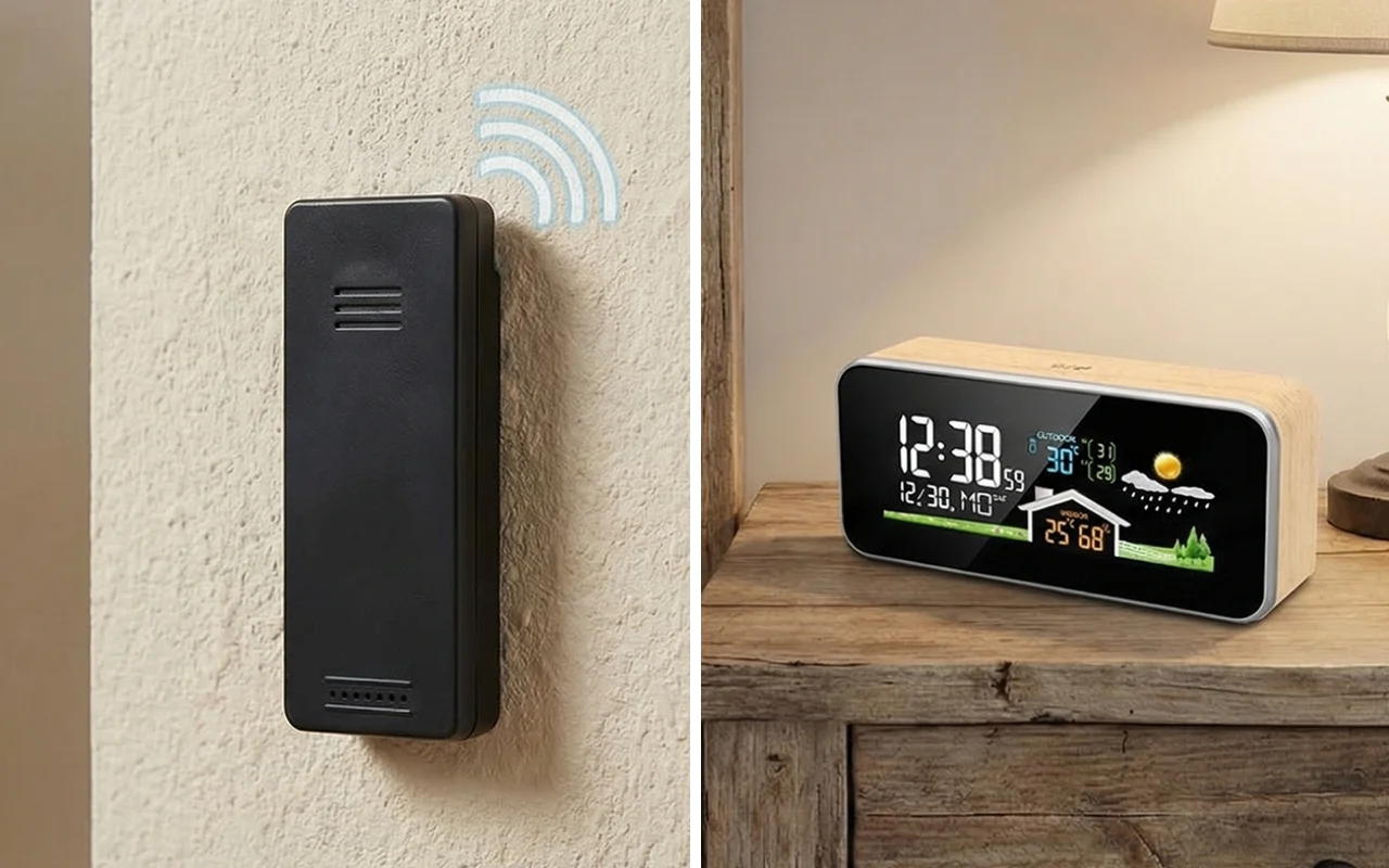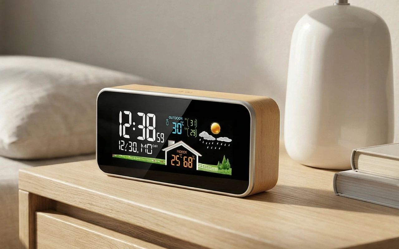 Uso isto na minha secretária de trabalho. As leituras de temperatura e humidade ajudam-me a decidir quando abrir a janela, e o aspeto em madeira é mesmo relaxante.
