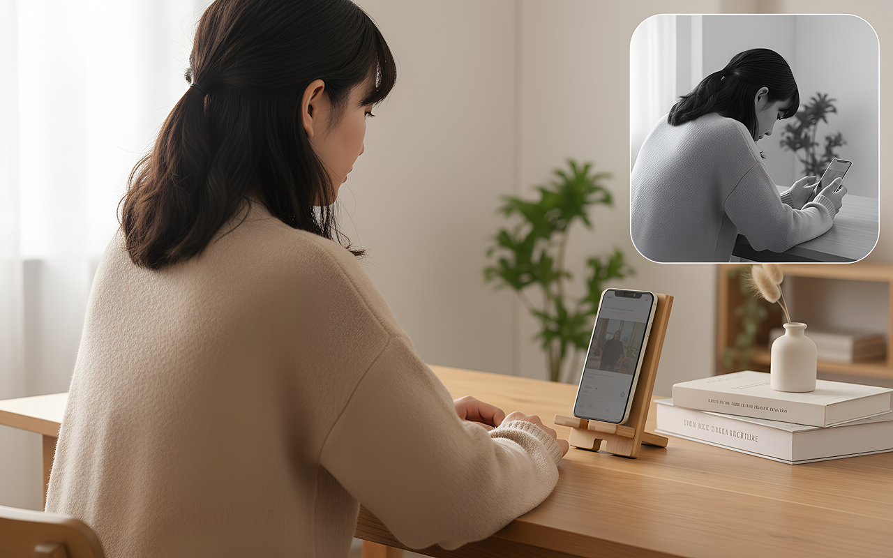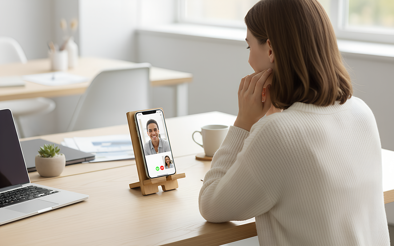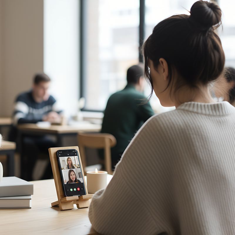 Este suporte de madeira mantém meu celular firme para as aulas online. Minhas mãos ficam livres para anotar e meu pescoço não dói mais!