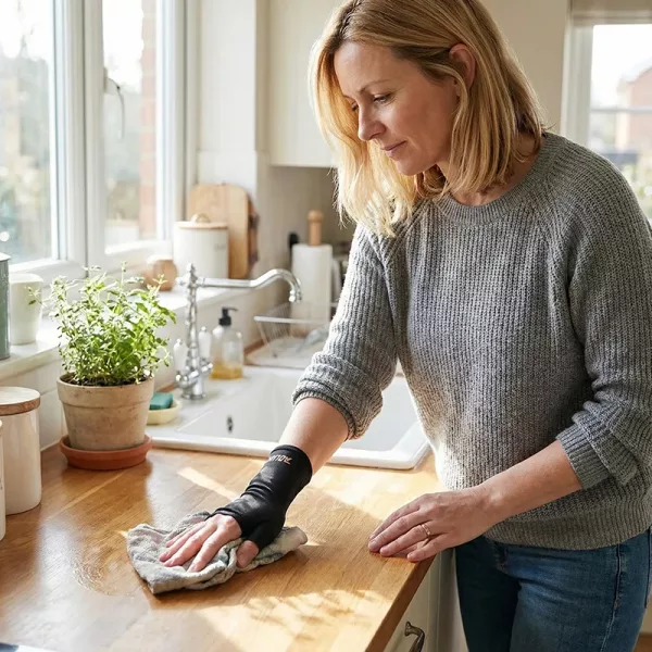 O tecido elástico e respirável abraça suavemente a sua mão para conforto o dia todo. Sem beliscar ou escorregar, proporcionando suporte constante durante o uso.