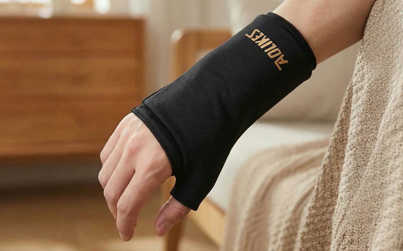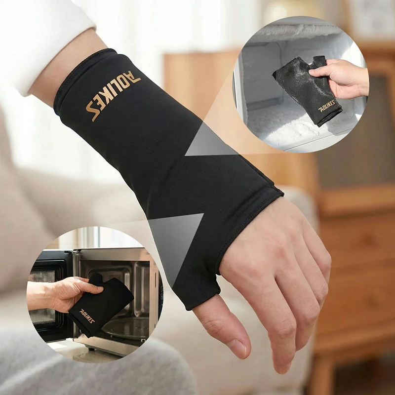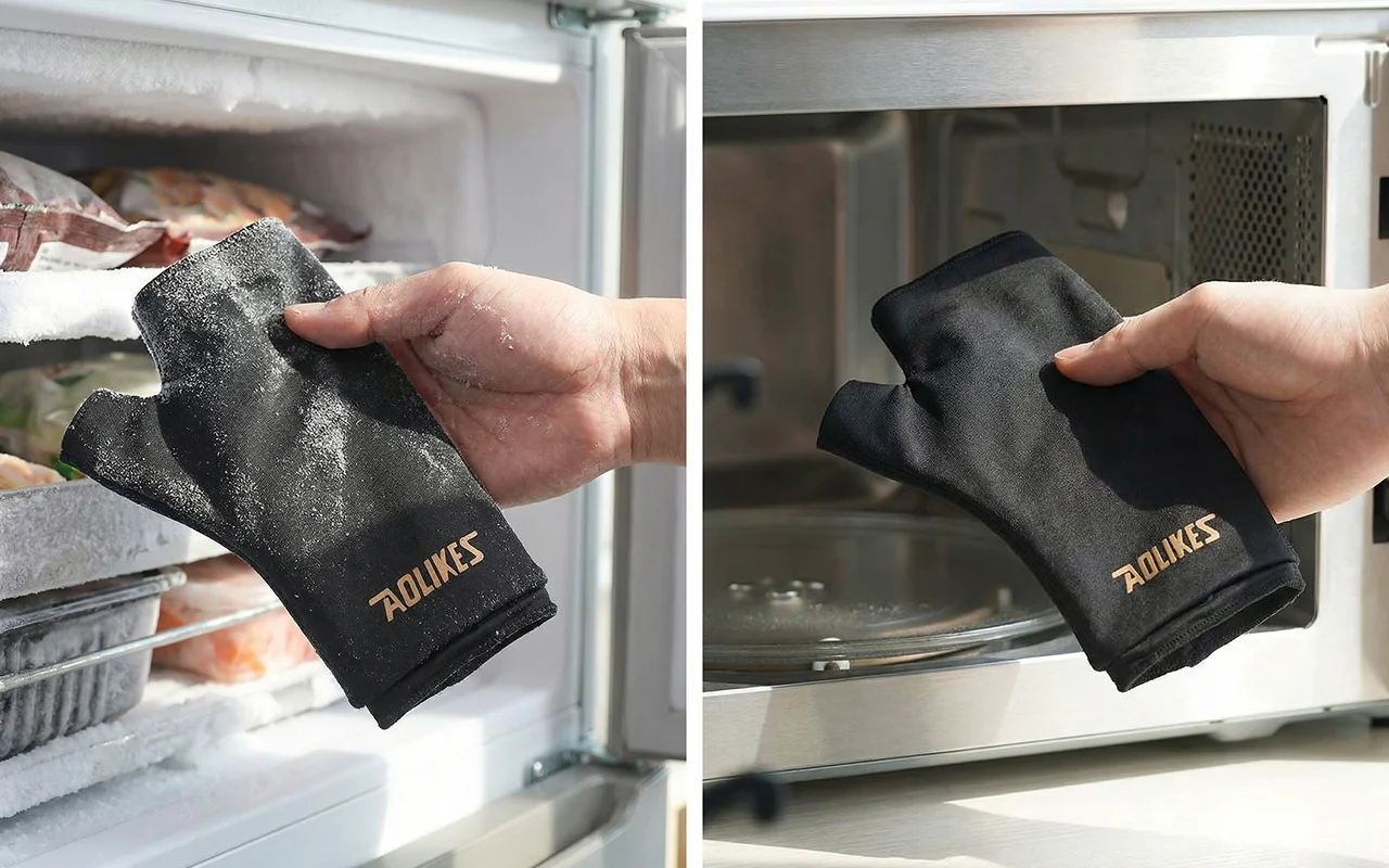 O calor da manga de gel alivia minha dor noturna no pulso.