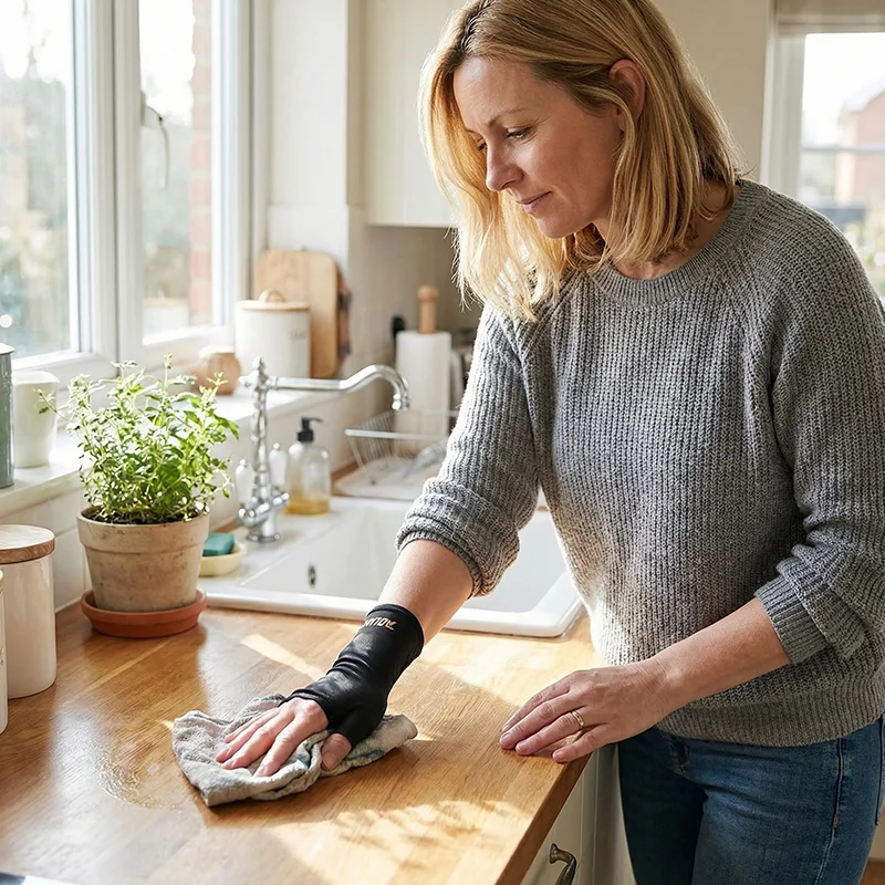 O tecido elástico e respirável abraça suavemente a sua mão para conforto o dia todo. Sem beliscar ou escorregar, proporcionando suporte constante durante o uso.